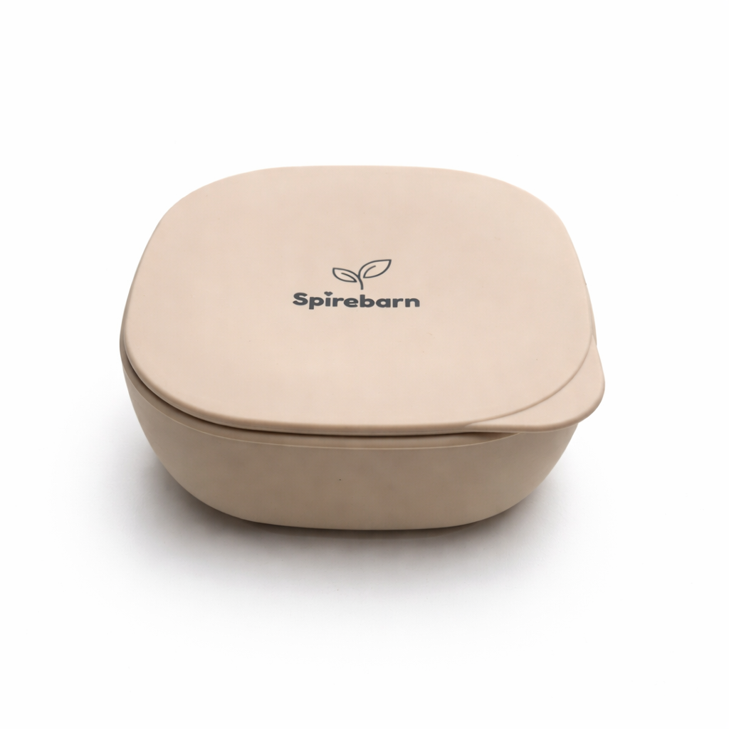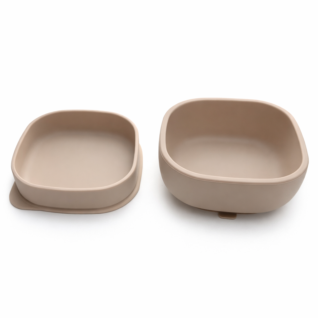 NYHET 2-i-1 silikonskål og tallerken med sugekopp for baby med lokk - Sandstone