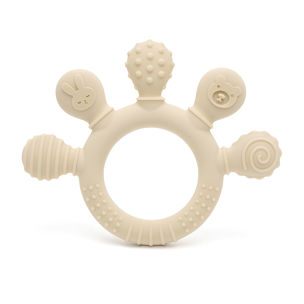 Hver av de fem tuppene har ulik tekstur og form: alt fra små prikker til spiraler, ribber og søte dyremotiver. Dette gir maksimal lindring ved tannfrembrudd, samtidig som babyen får utforske nye sanseinntrykk som styrker både motorikk og nysgjerrighet.