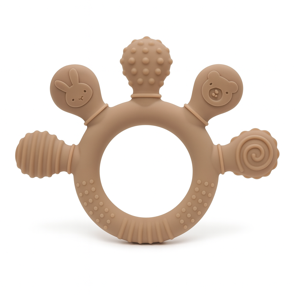 Hver av de fem tuppene har ulik tekstur og form: alt fra små prikker til spiraler, ribber og søte dyremotiver. Dette gir maksimal lindring ved tannfrembrudd, samtidig som babyen får utforske nye sanseinntrykk som styrker både motorikk og nysgjerrighet.