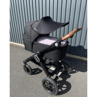 - Solskjermen kan vris til sidene alt etter hvor solen kommer fra. Dra den lengre frem på kalesjen dersom det er lav sol.