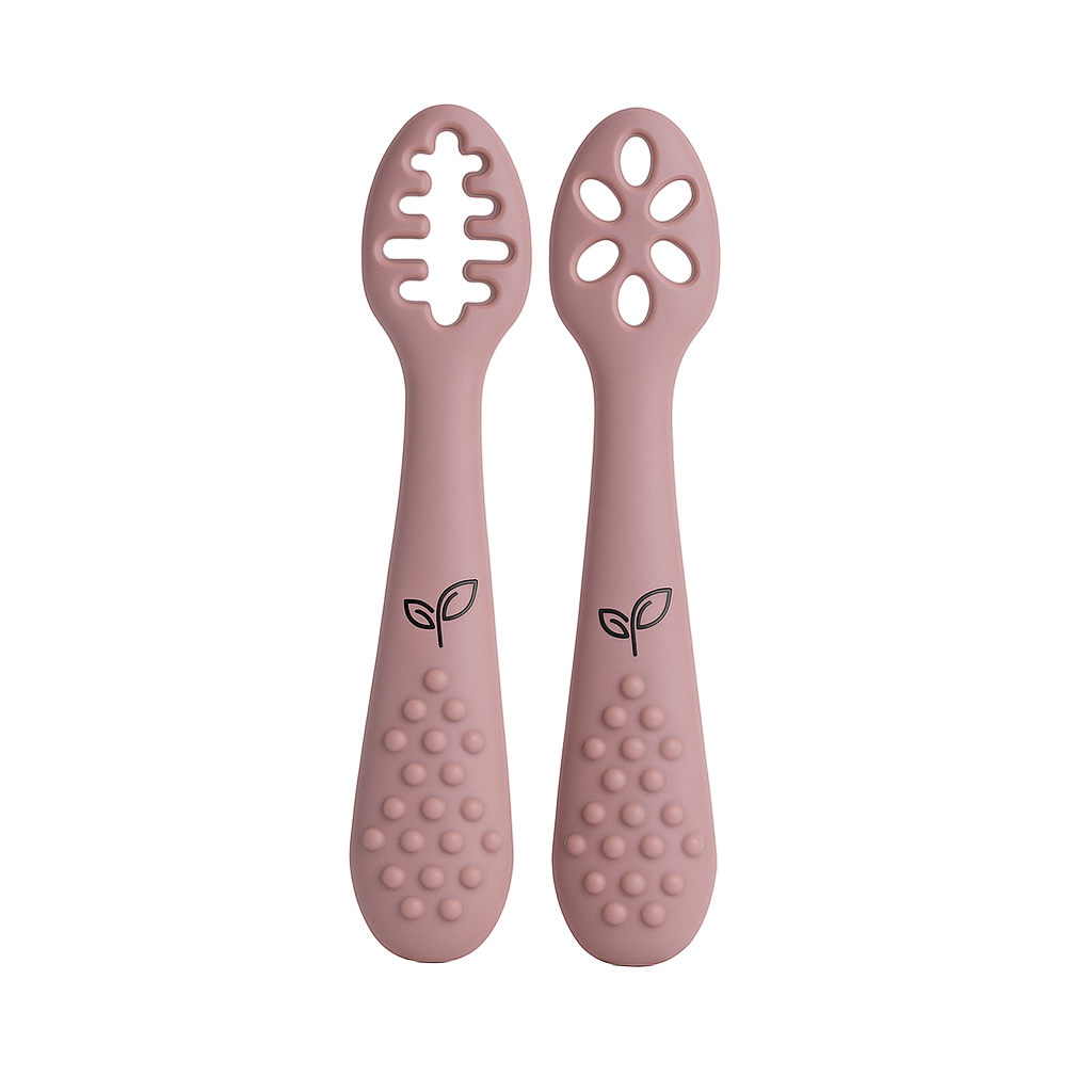 Skjeene er laget i fleksibel, trygg silikon, skånsom mot både tannkjøtt og små munner.